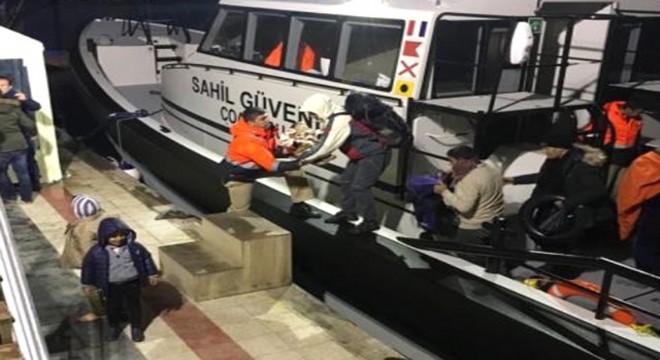 İzmir’in Çeşme ilçesi açıklarından, yasadışı Yunan adalarına geçmeye çalışan 44 göçmen, Sahil Güvenlik ekiplerince kurtarıldı. Gece saat 02.00 sıralarında, Çeşme ilçesi Karaabdullah Burnu güneyi açıklarında, bir grup göçmen, yasadışı yollar ile Yunan adalarına geçmeye çalıştıkları lastik botun hareket etmemesi üzerine yardım talebinde bulundu. İhbar üzerine harekete geçen Sahil Güvenlik ekipleri, hareket etmeyen lastik bot içerisindeki 36 Suriye ve 8 Eritre uyruklu olmak üzere 13'ü çocuk, 12'si kadın toplam 44 göçmeni kurtardı. Göçmenler işlemleri yapılmak üzere İl Göç İdaresi'ne teslim edildi.