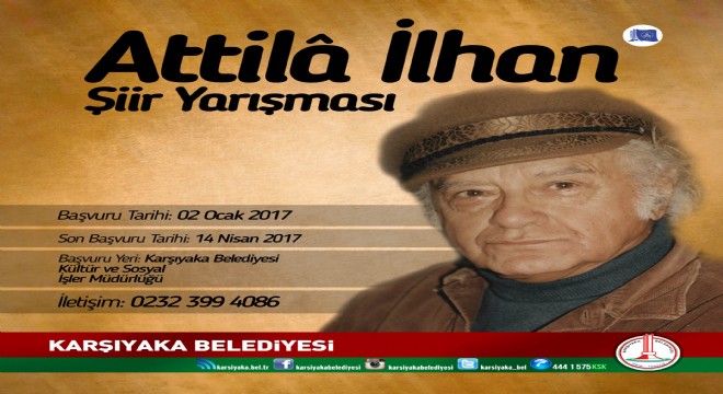 Karşıyaka Belediyesi, kentin yetiştirdiği en önemli değerlerden biri olan usta şair Attila İlhan’ın anısına iki yıldır düzenlediği şiir yarışmasını geleneksel hale getirdi. Yeni şairler ve yeni eserlerin topluma kazandırılmasına da katkı sağlayacak yarışmanın bu yılki etabı için başvurular kabul edilmeye başlandı. Yarışmaya katılmak isteyenler; eserlerini elden, posta ya da kargoyla, 14 Nisan 2017 tarihine kadar Karşıyaka Belediyesi Kültür ve Sosyal İşler Müdürlüğü’ne ulaştırabilecek.