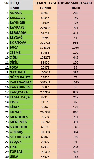 Türkiye’nin üçüncü büyük kenti İzmir’de 3 milyon 320 bin 18 seçmen ilçelerde kurulacak 10 bin 200 sandıkta oylarını kullanacak. En çok seçmeni olan ilçelerin başına 379 bin 308’le Buca geliyor. Karabağlar’ın 362 bin 437, Bornova’nın 330 bin 715, Karşıyaka’nın 276 bin 952, Konak’ın 263 bin 381, Bayraklı’nın 225 bin 832 seçmeni bulunuyor.