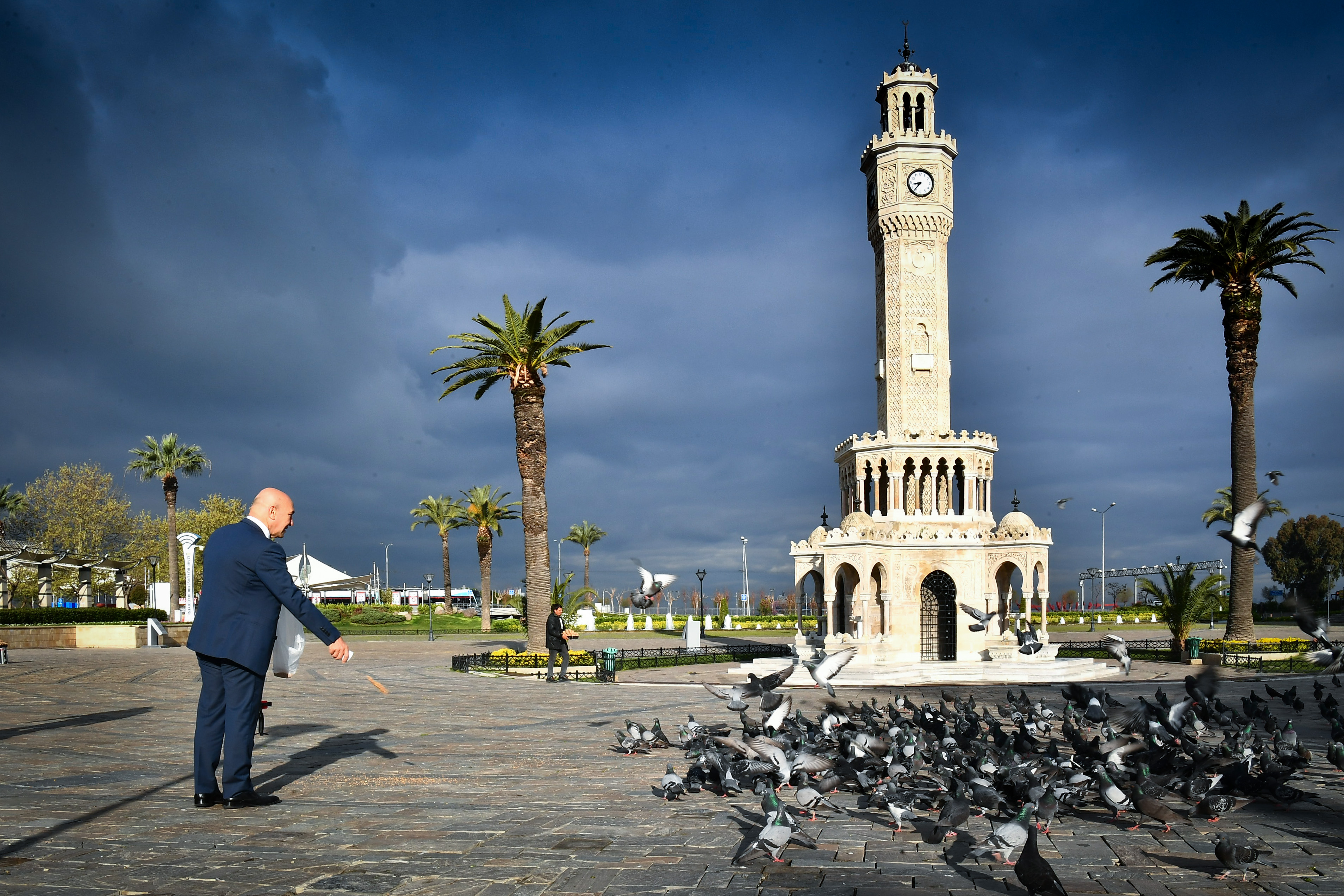 İzmir Büyükşehir Belediye Başkanı Tunç Soyer Konak Meydanı’nın simgesi haline gelen güvercinleri de unutmadı. İzmirlilerin attığı yemlerle beslenen güvercinler, meydanın eski kalabalığını yitirmesi yüzünden aç kalınca her gün bir görevli güvercinleri yemlemeye başladı. Başkan Soyer de özellikle bisikletle geldiği günler, sırt çantasında getirdiği yemlerle güvercinleri besleyerek mesaiye başlıyor.