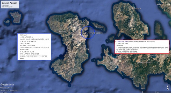 Türkiye, yeni bir NAVTEX yayınlayarak Yunanistan'ın Sakız Adası'nı Lozan Barış Antlaşmasını ihlal ederek silahlandırdığını ilan etti.