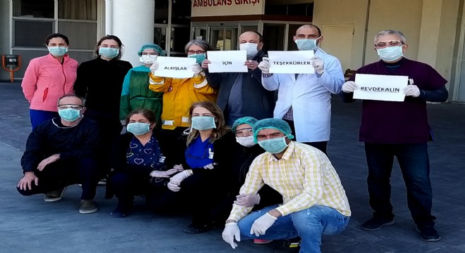 Acil servis önünde bir araya gelen Koronavirüs savaşçıları, ‘Alkışlar için teşekkürler’ ve #Evdekalin mesajları ile Çeşme halkına teşekkür ettiler.