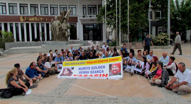 Çeşme Demokrasi Platformu'nda yer alan Pir Sultan Abdal Kültür Derneği Çeşme Şubesi, Doğu-Der, Eğitim-Sen Çeşme Temsilciliği, ÇYDD Çeşme Şubesi, ADD Çeşme Şubesi, Sağlık Emekçileri Sendikası, Büro Emekçileri Sendikası, HDP ve TKP temsilcileri ve yazarların katıldığı oturma eyleminde, "OHAL-KHK Kalksın, İhraçlar Görevine Dönsün, Nuriye Gülmen, Semih Özakça Yaşasın" pankartı da açıldı.