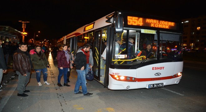 31 Aralık 2018 akşamı, metro bağlantılı çalışan ve ana arterlerde sefer yapan bazı otobüs hatlarında son sefer saatleri 01.45 ve 02.05’e kadar uzatıldı. Ayrıca 24.00 ile 06.00 saatleri arasında çalışan 910 numaralı Gaziemir-Konak, 920 numaralı Çiğli-Konak, 930 numaralı Bornova-Konak, 940 numaralı Buca-Konak, 950 numaralı Balçova-Konak hatlarında gece seferleri devam edecek. Bu hatlarda 30 dakika ara ile Konak Bahribaba otobüs peronlarından servis yapılacak. Resmi tatil olan 1 Ocak 2019 Salı günü ise “Pazar günü sefer saatleri” uygulanacak.