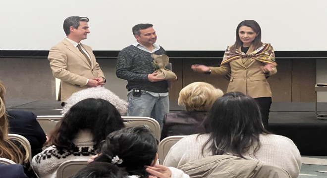 Söyleşi sonunda Çeşme Kaymakamı Mehmet Maraşlı , yazar İzgüder'e katılım sertifikası takdim ederken proje koordinatörü Arzu Güleryüz Maraşlı da bir Sakız ağacı fidanı hediye etti.